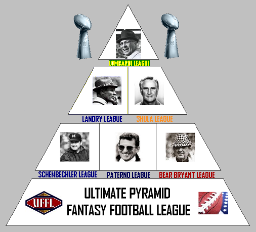 The UPFFL spawned from the League of Champions (2002-2009) in 2010. The LOC consisted of four free total point qualifier leagues and a main Champions league. The LOC was a MFL Showcase League for eight years. We've added some head to head leagues, some pay leagues, and a pyramid system where teams move up or down depending on well they do the previous season. Once again, we've teamed up with MyFantasyLeague (MFL), home of the Internet's #1 fantasy football league management system. The UPFFL is a MFL Showcase League with all the leagues being hosted for FREE. All pay leagues have a 100% payout. The UPFFL consists of six, twelve team leagues all competing in a tiered 'Pyramid' system for the Ultimate Championship. The three tiers are the Semi-Pro, Pro, and Champions Tier. The goal is to do well enough in your leagues and move up the pyramid. Champions (A) / \ Pro (B, C)